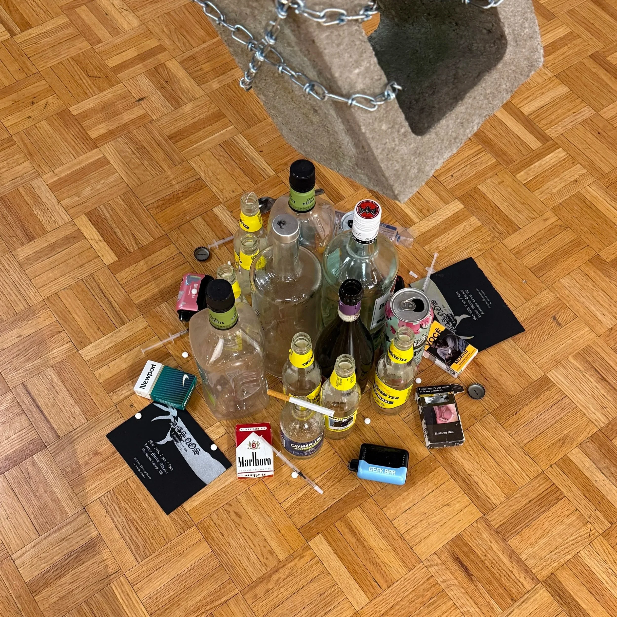 Description: This piece looks at the burden of substance abuse and drug addiction and uses a heavyweight object, a concrete block, to represent the pull of one’s addictions. The two garments hanging above the sculpture are from my Senior fashion show, titled DESNOS